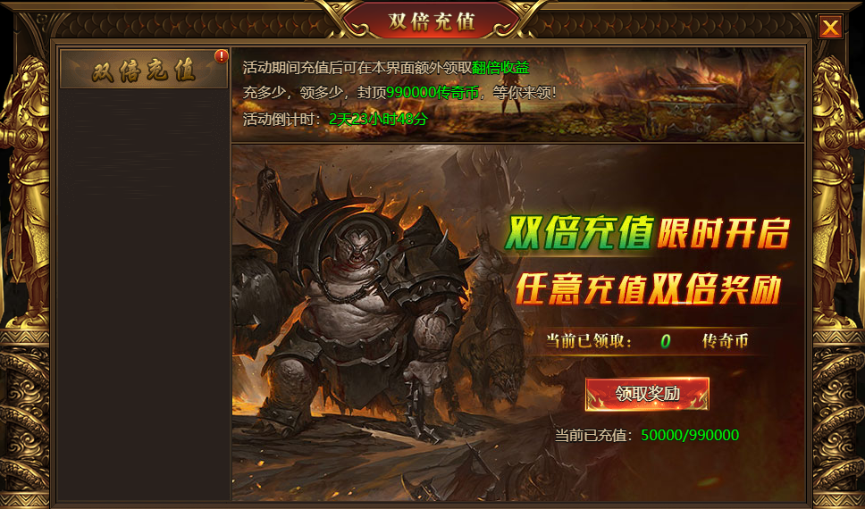 1.活动期间充值可在活动页面领取与充值金额等值的传奇币奖励