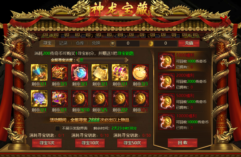 1.活动期间可以在神龙宝藏中抽取各种稀有道具、装备和传奇币