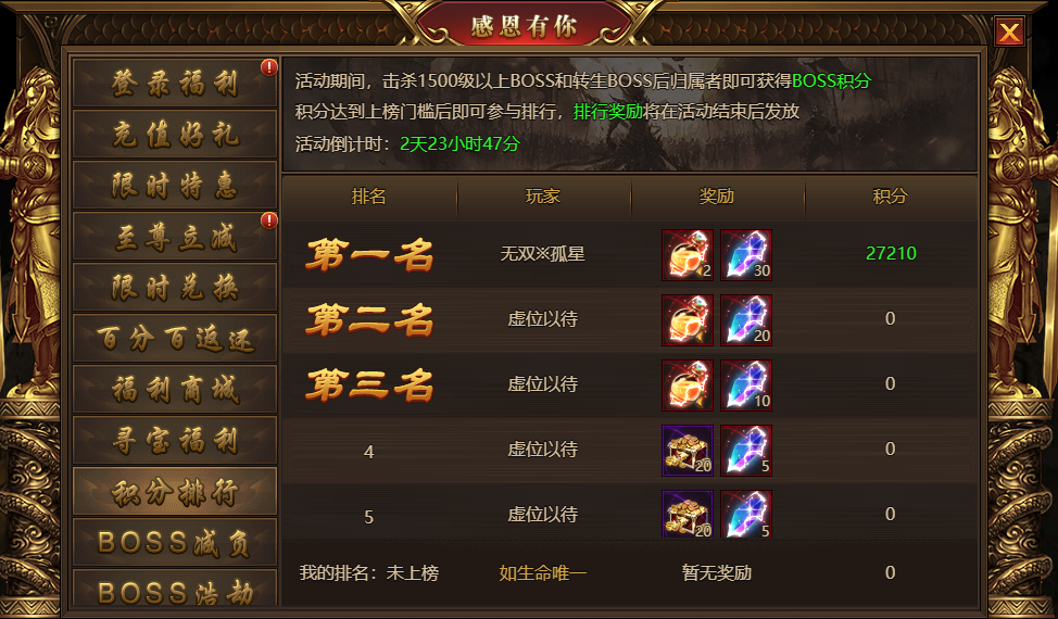 1.活动期间击杀1500级以上的boss和转生boss获得积分,活动结束后更加排行邮件发送奖励